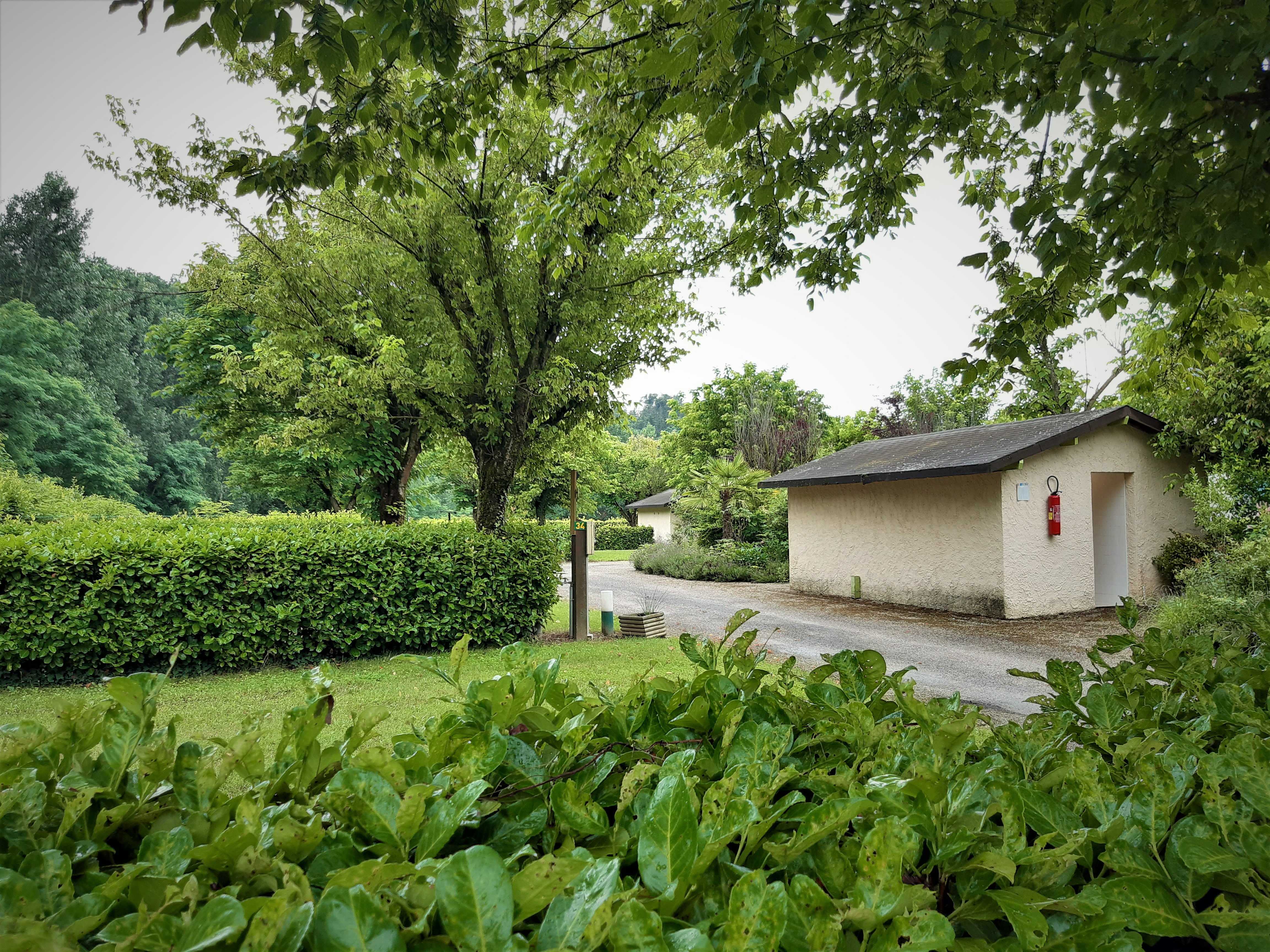 de mobilhomecaravans staan, je loopt dan langs een smal beekje. De supermarkt is ook op loopafstand.